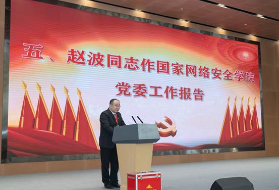 赵波在报告中总结了建院以来的主要工作和基本经验。自学院成立以来,院党委团结带领广大师生员工抢抓机遇、艰苦创业,超额完成“十三五”(2016-2020)发展任务,圆满实现一流示范项目初创成型期(2017-2020年)发展目标,掀开双校区办学新篇章,赢得“十四五”规划精彩开局,学院进入机制成熟期(2021-2023年)高质量内涵式发展新阶段。学院党委自成立以来踔厉奋发、开拓进取,学院综合实力和办学水平大幅提升,学科地位和社会声誉显著提高。学院的办学实践,加深了我们对“建设什么样的学院、怎样建设好学院”等根本性问题的认识,积累了推动学院进一步发展的宝贵经验:必须提高站位,推进主体责任和监督责任“一起抓”,必须统筹兼顾,坚持教育使命与学科使命“一肩挑”,必须立地顶天,实现网络强国与扎根基地“一线牵”,必须内聚外联,激活党建工作与教育事业“一盘棋”