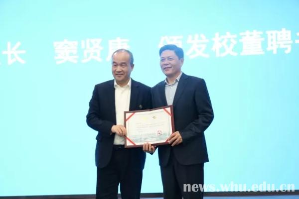 捐赠仪式现场,学校聘任程理财和校友韦奇志、喻鹏为董事,窦贤康为新聘董事颁发聘任证书。