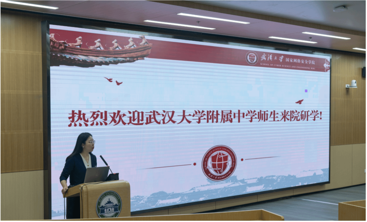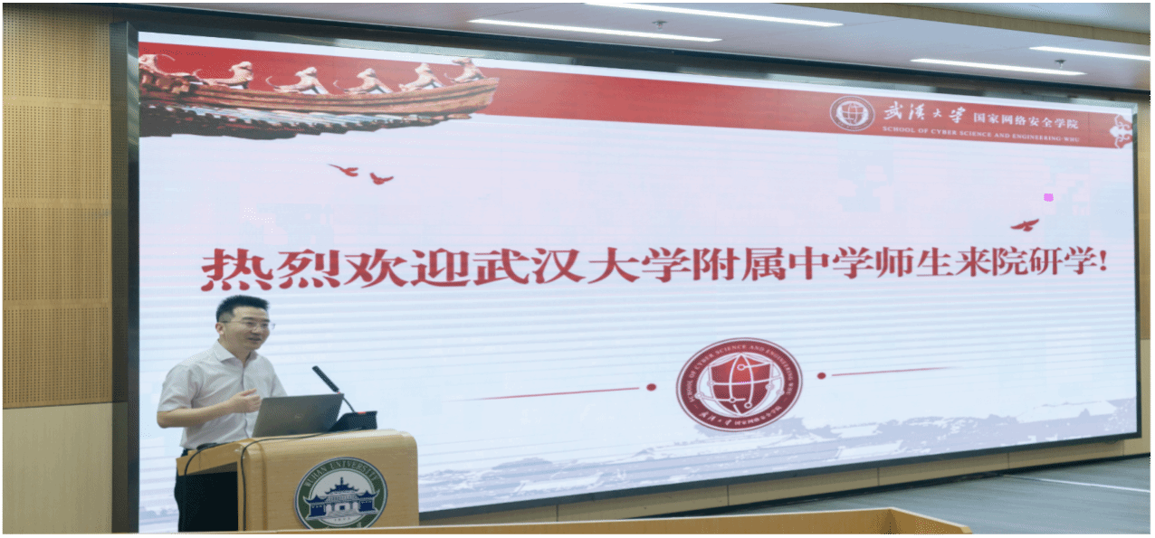 的宣传片。最后,学院博士研究生刘洋为武大附中的师生们做了题为《揭开密码学的神秘面纱》的网络安全知识宣传专业讲座。30分钟的讲座,让同学们了解了密码的特色内涵、实际应用、发展趋势、前沿科技等,深刻认识了保护网络安全对于维护国家安全的重要性。