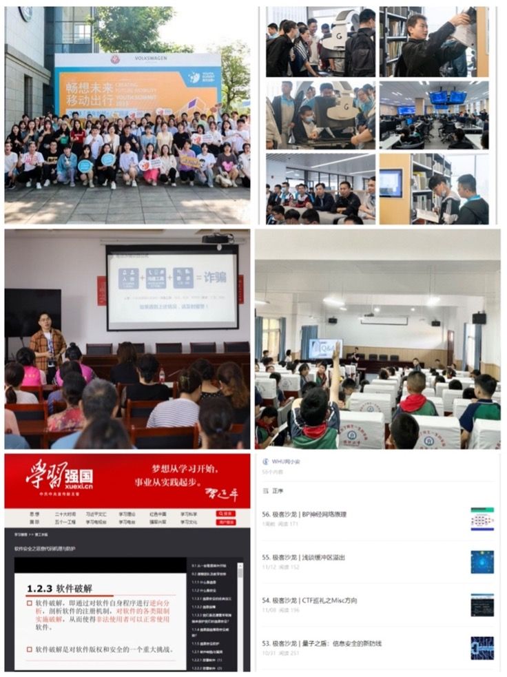 抓好网上网下科普工作,培养大众科普素养。学院常年组织网络安全知识走进中小学、走进社区等志愿活动,通过学院开放日、微课堂、学术沙龙等方式面向青年群体不定期开展科普讲座。举办了Open Harmony城市技术论坛、“青年创想+”教育公益项目推介会、2023年度“龙芯杯”信创攻防赛等大型高端学术、竞赛活动,累计接待人次多达3000以上。此外,学院不断扩展网络宣传阵地,紧抓不同群体受众的接受特点,建立差异化宣传矩阵:学院学生工作微信公众号“WHU网小安”设有“极客沙龙”科普专栏,对科普信息实时传递,已累积更新56篇推文;学院开发《软件安全》课程被学习强国APP慕课频道收录,观看人数超25万;参与湖北电视台《我说国家安全》节目录制,积极宣传网络安全知识。
