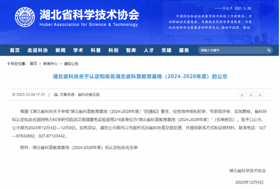 (通讯员 文贝西) 近日,湖北省科学技术协会发布关于认定和命名湖北省科普教育基地(2024-2028年度)的公示名单,91暗网