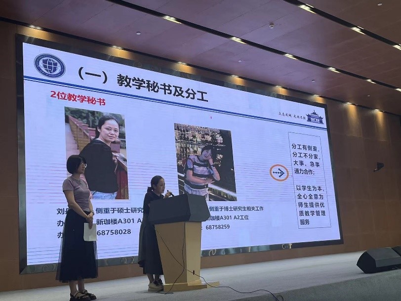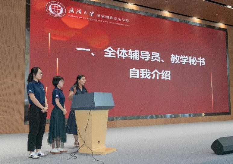全体辅导员和教学秘书上台与同学们相识并做自我介绍。教学办张昳宁老师和刘丹老师详细为同学们介绍学业相关流程细节,并着重强调注意事项。研工办余艳霞、刘路和石川老师分别为同学们介绍学生工作内容及后续服务管理工作的开展情况。