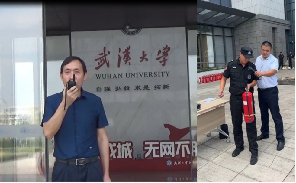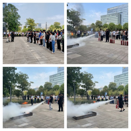 在室外疏散集合点,基地物业的消防专员给师生门介绍了疏散逃生方法和注意事项,讲解了消火栓、灭火器的使用方法,并由物业特勤队员进行了消防水带的展开、链接演示。在接下来的实操实训环节,师生轮流进行了灭火器灭火实际操作体验。整个演习过程组织有序、安排有度、行动有力、落实有效。