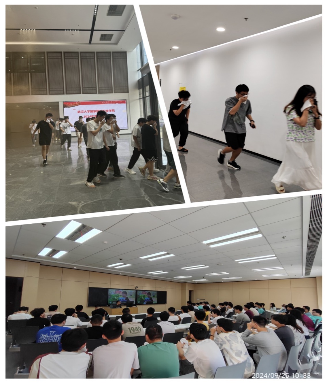 2024年度消防演习开始”,11时许,随着演习现场指挥员一声令下,尖利的消防警报声在楼内骤然响起,烟雾迅速弥漫,消防广播开始播报安全疏散信息,电梯迫降至一楼。学院各办公室和物业工作人员迅速到达指定岗位督促、引导师生疏散。同学们闻警而动,在老师和工作人员的引导下,按照就近疏散、分流疏散的原则,迅速、有序地从各个疏散通道撤离至安全地带,并在疏散集合点集合。