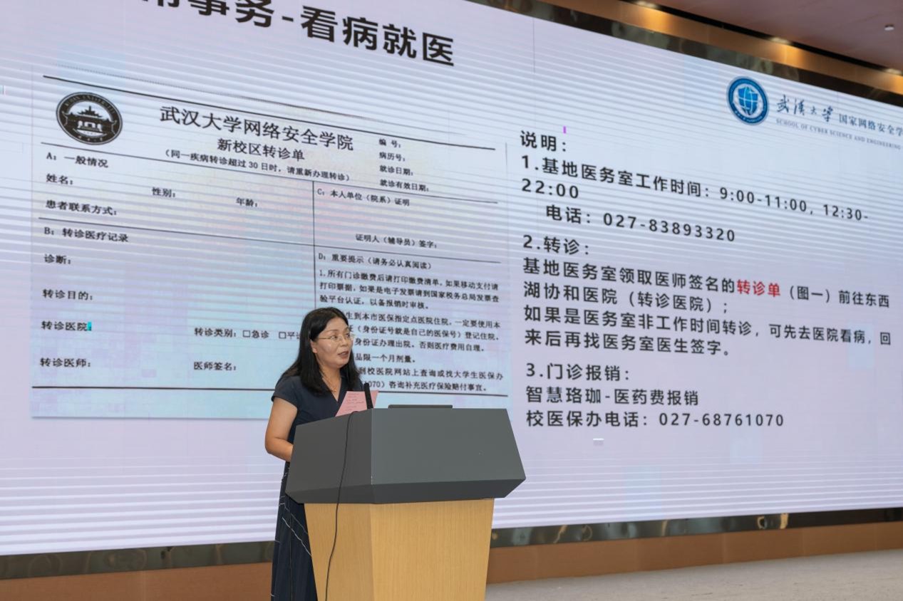 研究生辅导员余艳霞老师为同学们详细介绍了研究生日常管理事务,包括看病就医、请假手续、外出实习科研及联合培养、心理咨询、车辆入校申请等服务信息,以及奖助学金政策、研究生课余活动等,帮助大家更好地适应校园生活。