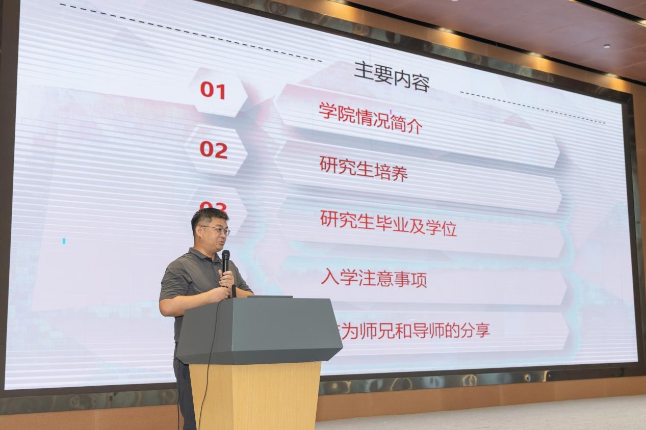 彭国军教授为同学们介绍了学院发展历程和运行现状,又详细解读了硕士和博士培养方案中学业相关流程细节,包括课程安排、选课流程、考试要求等,并着重强调了注意事项;此外,彭教授还结合自身研究生求学经历和导师身份为同学们提出了细致的建议,帮助新生更好地规划研究生阶段的科研学习。