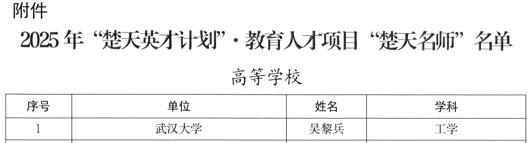 吴黎兵教授长期耕耘于教学一线,始终坚持立德树人根本任务,积极推进教育教学改革,注重学生创新能力与实践能力培养,深受师生广泛赞誉。此次获评“楚天名师”,是对其多年潜心育人成果的高度肯定。