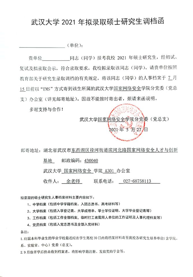 4.档案的邮寄通讯地址为:湖北省武汉市东西湖区径河街道滨河北路国家网络安全人才与创新基地网安学院新珈楼A301室余老师收。联系电话:027-68758113。