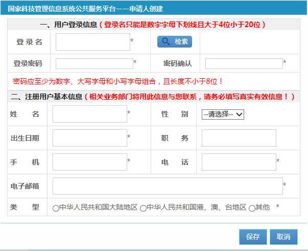 (2)没有在国家科技管理信息系统公共服务平台开通账号和密码的,需先向科发院提供以下信息由科发院负责开通:登录名和密码(无需提供,由科发院按规则统一创建)、姓名、性别、出生日期、职务、手机、固定电话、邮箱和证件类型及号码。
