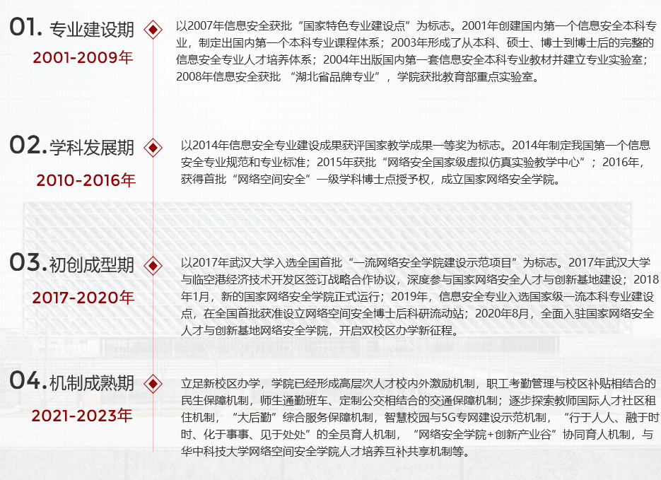 培养模式独特,教学理念先进。以综合性大学多学科交叉融合背景为优势,实行双校区办学:一、二年级本科生在校本部就读,实行大类招生和通识培养,打好专业基础,体验武大文化,涵养珞珈情结;三、四年级本科生和全体研究生在新校区就读,接受专业教育和科研训练,培养核心能力,感受网安文化,培养国家栋梁和城市精英。学生免试保研率、一次性就业率、出国研修率均处于学校前列。注重学生德智体美劳全面发展,培养学生掌握1-2项终身受用的体育运动技能。20年来,信息安全专业系列教学研究成果,对全国信息安全专业建设提供了参考和重要影响,人才培养卓有成效。学生在教育部五大竞赛及国际性赛事中摘金夺银、屡获殊荣,本科生在顶级会议和杂志发表高水平论文屡见报端。毕业生中涌现出了互联网行业领军人物雷军、“全国道德模范”黄来女、全球权威反病毒年度大奖获得者潘宣辰和乔伟、美国“斯隆研究奖”获得者彭健等一批优秀校友。
